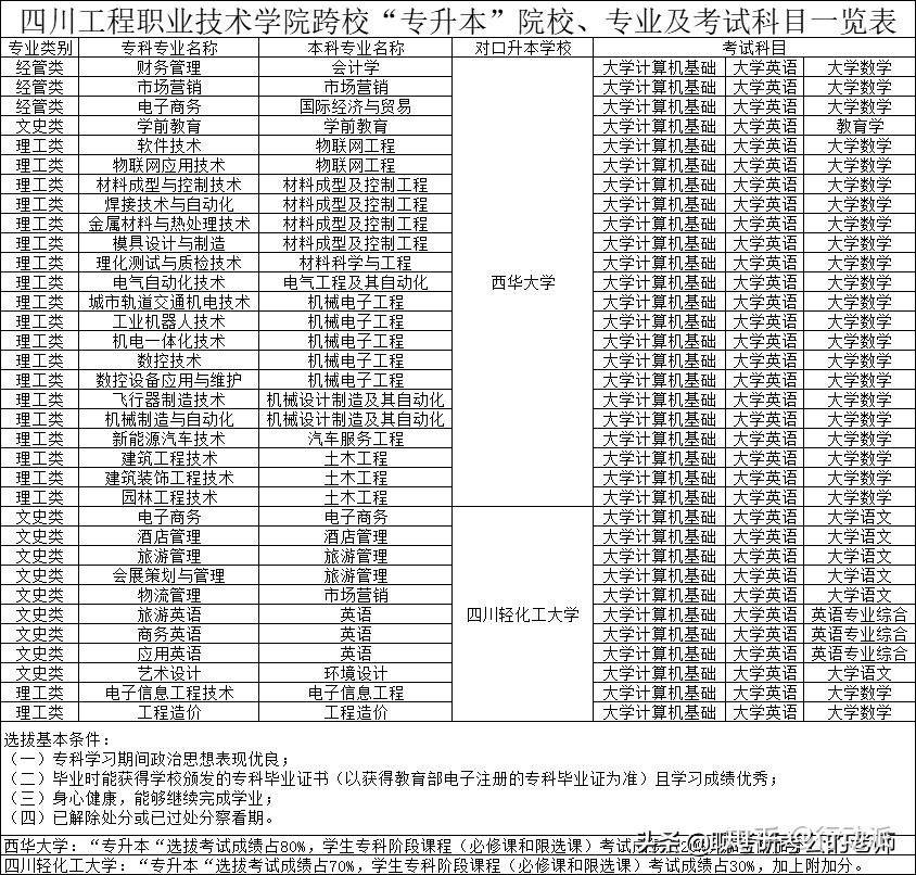 四川工程职业技术学校跨校“专升本”院校、专业及考试科目一览表