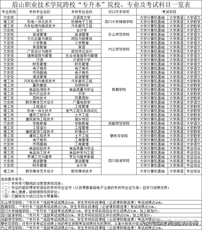 眉山职业技术学校跨校“专升本”院校、专业及考试科目一览表