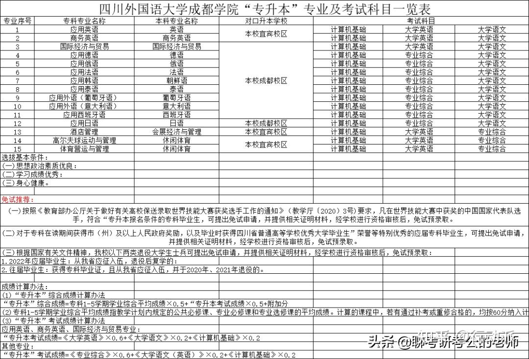 四川外国语大学成都学校“专升本”专业及考试科目一览表