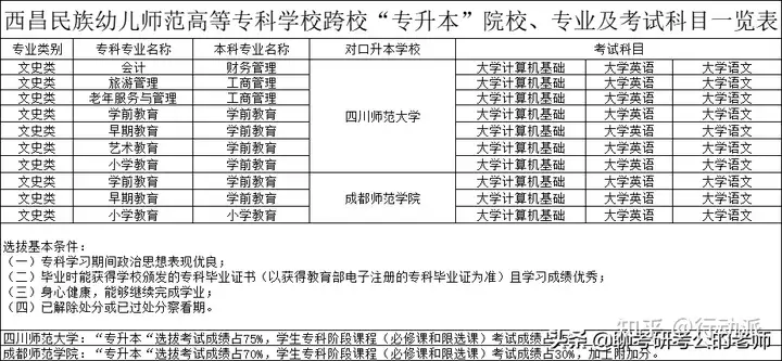 西昌民族幼儿师范高等专科学校跨校“专升本”院校、专业及考试科目一览表