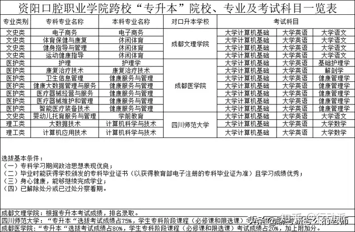资阳口腔职业学校跨校“专升本”院校、专业及考试科目一览表