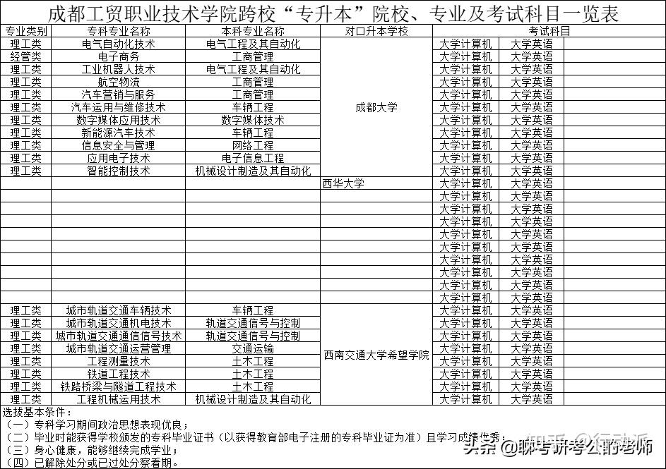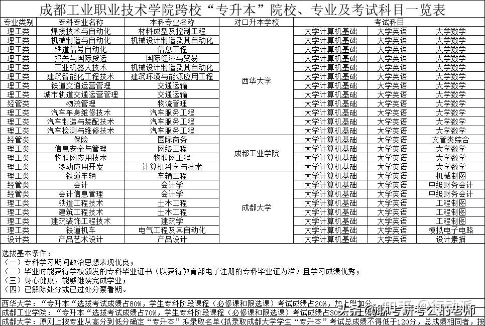 成都工业职业技术学校跨校“专升本”院校、专业及考试科目一览表