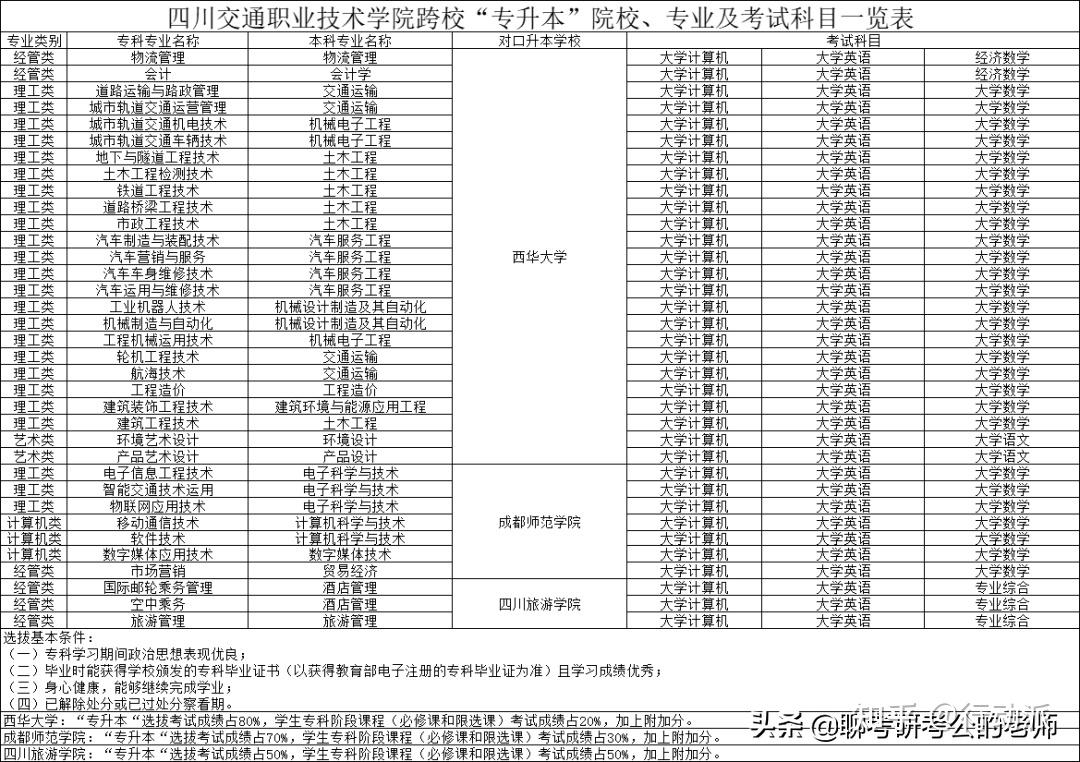 四川交通职业技术学校跨校“专升本”院校、专业及考试科目一览表