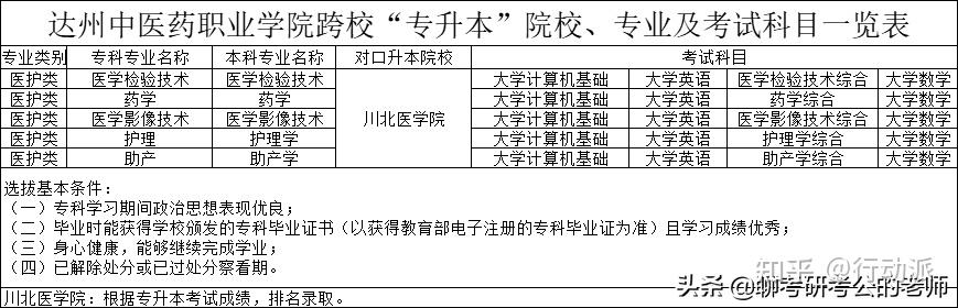 达州中医药职业学校跨校“专升本”院校、专业及考试科目一览表