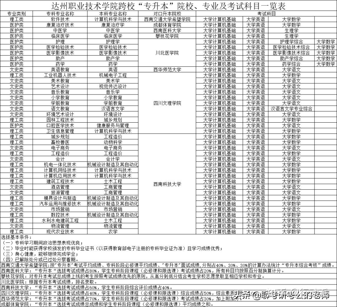 达州职业技术学校跨校“专升本”院校、专业及考试科目一览表