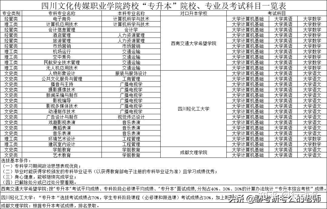 四川文化传媒职业学校跨校“专升本”院校、专业及考试科目一览表