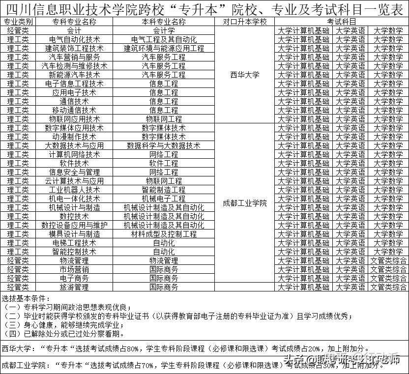 四川信息职业技术学校跨校“专升本”院校、专业及考试科目一览表