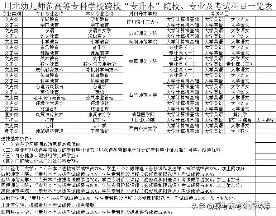 川北幼儿师范高等专科学校跨校“专升本”院校、专业及考试科目一览表