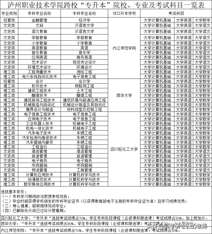 泸州职业技术学校跨校“专升本”院校、专业及考试科目一览表