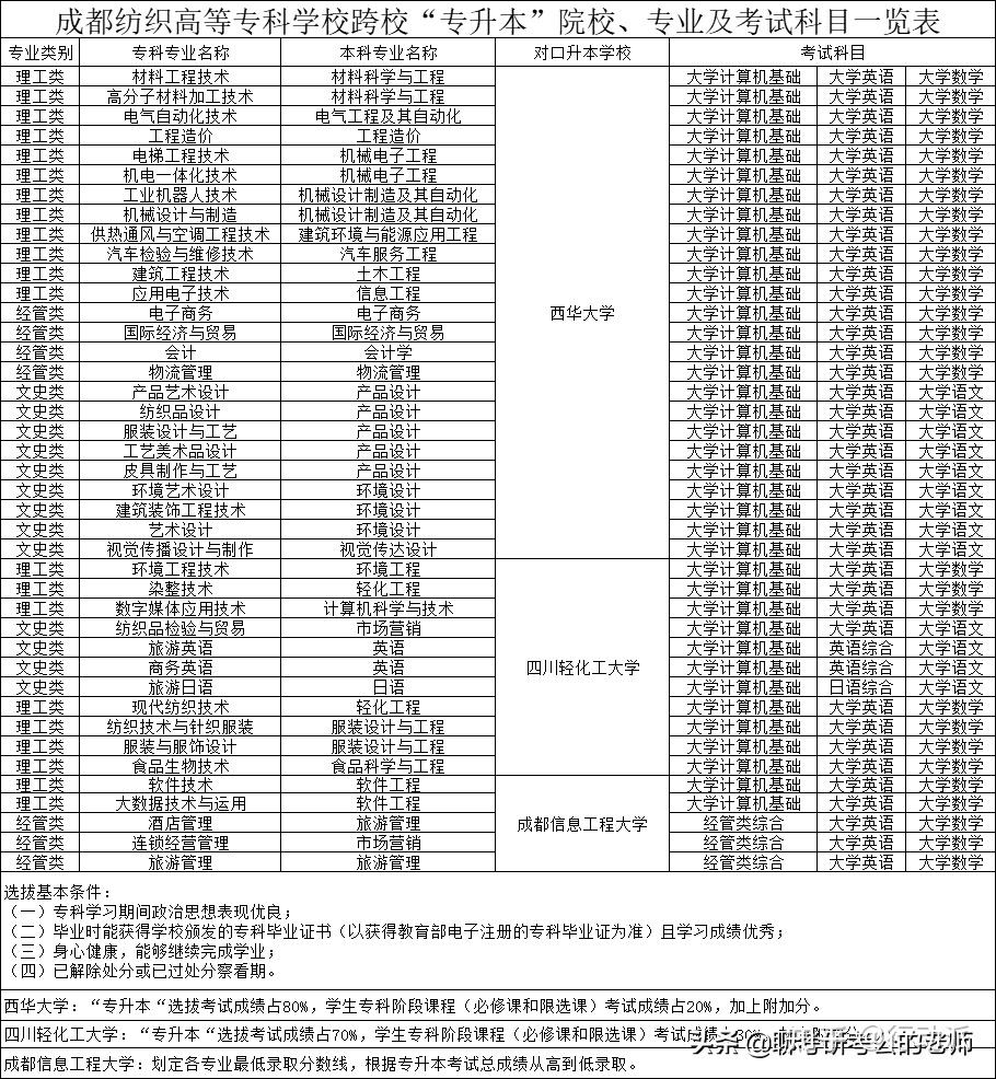 成都纺织高等专科学校跨校“专升本”院校、专业及考试科目一览表