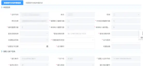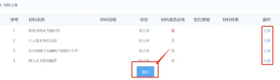 (4)上传材料:职业资格复印证书(必传)、个人基本身份证明、社会保障卡金融账户或银行卡号、网上证书查询截图。确认信息无误后点击【提交】。