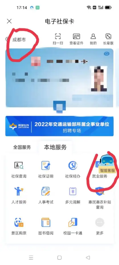1、 登录“天府市民云APP”→选择“电子社保卡”(或直接通过支付宝、微信进入电子社保卡页面)→选择“本地服务中的就业服务”。