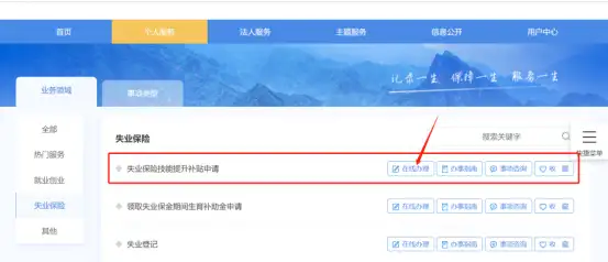 (2)选择【个人服务】→【失业保险】→【失业保险技能提升补贴申请】