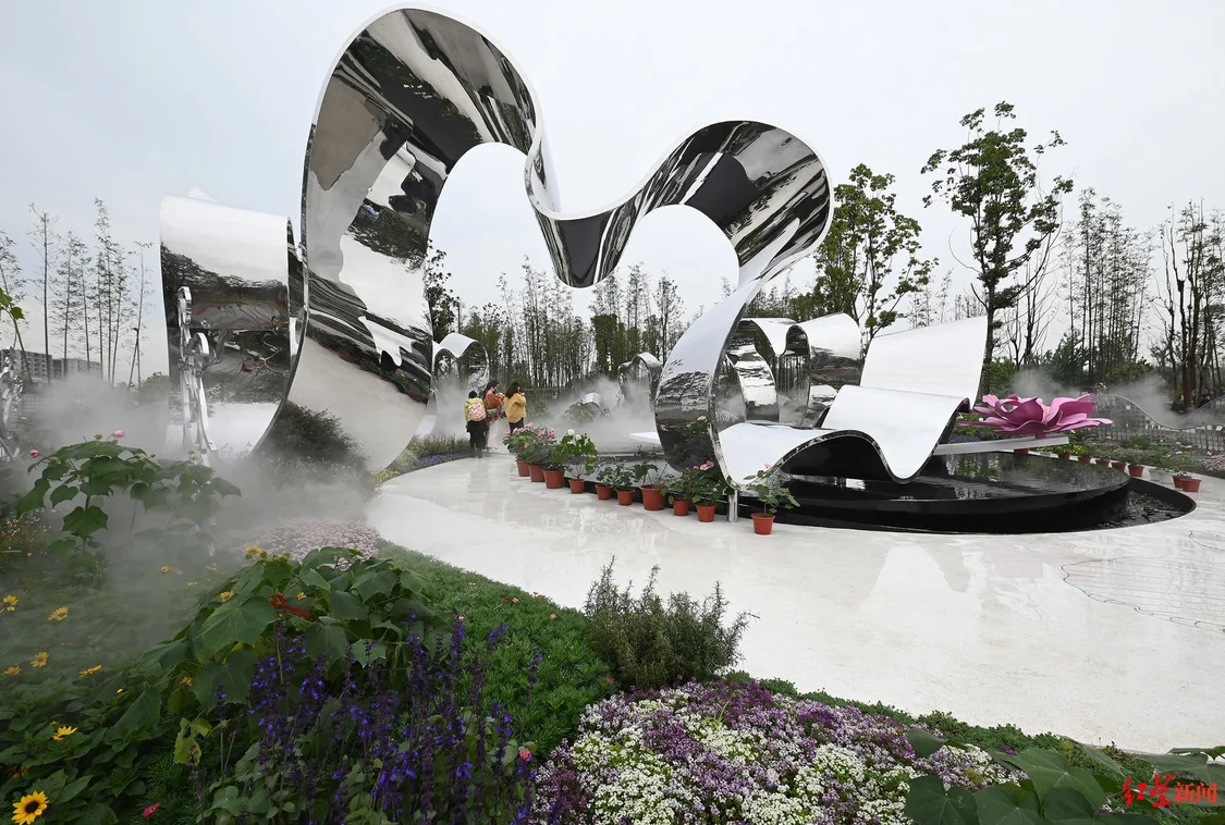 成都展园内,镜面不锈钢搭建成的山形艺术造型好似一朵盛开的芙蓉花,并置入了十二月花神文化脉络,设计构思以花为媒,通过多元造景手法,传承创新花文化特色,充分融合生态、人文、科技、艺术,满足市民的参与性、互动性。