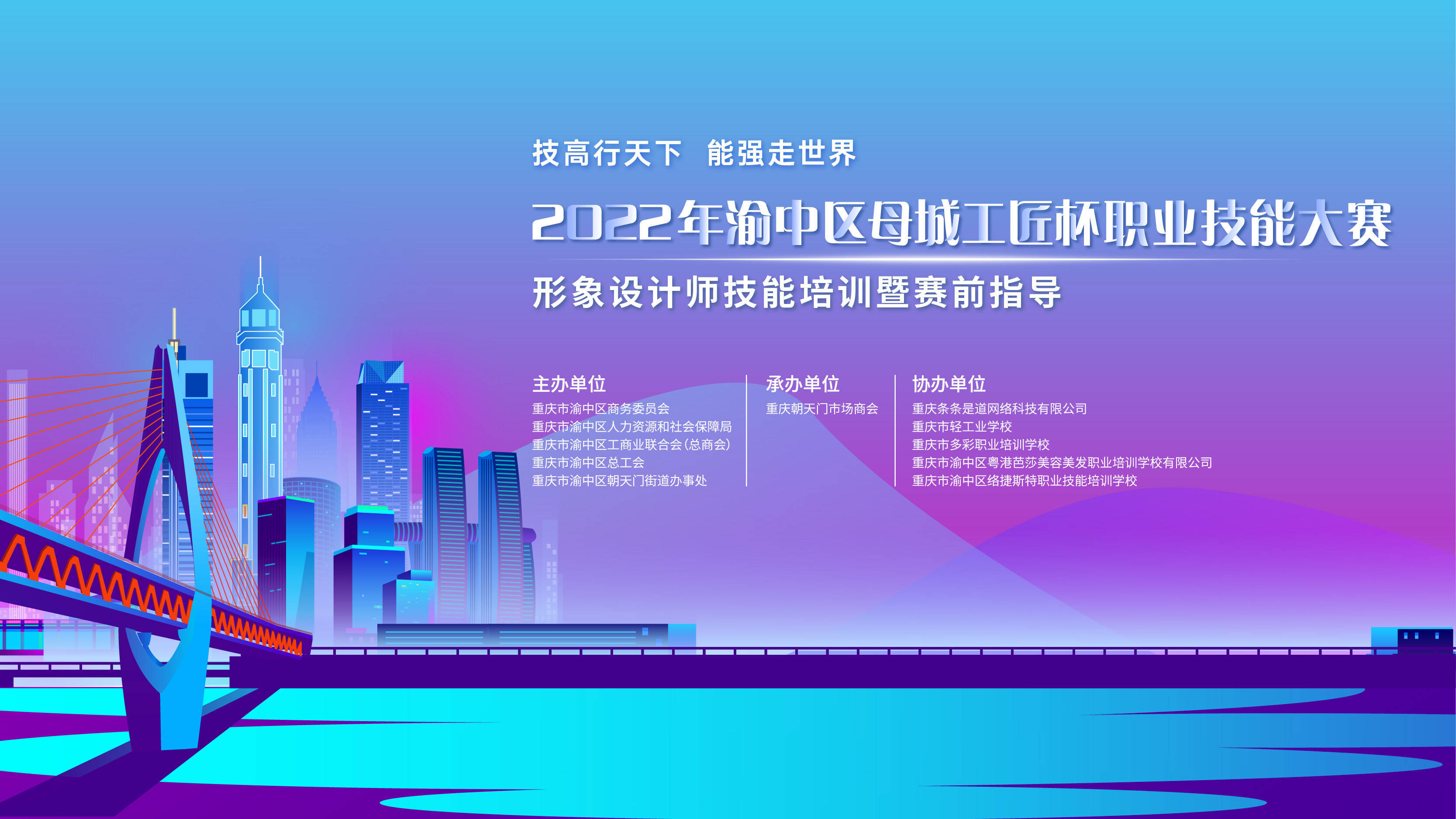 为引领辖区内传统产业提档升级,促进消费形式焕发新活力,打造时尚聚集地和高质量人才聚集地相融合的辖区新面貌,不断推动技能引导实践,促进行业新发展,由重庆市渝中区商务委员会、重庆市渝中区人力资源和社会保障局、重庆市渝中区工商业联合会(总商会)、重庆市渝中区总工会、重庆市渝中区朝天门街道办事处联合主办,重庆朝天门市场商会承办,重庆条条是道网络科技有限公司、重庆市轻工业学校、重庆市多彩职业培训学校、重庆市渝中区粤港芭莎美容美发职业培训学校有限公司、重庆市渝中区络捷斯特职业技能培训学校共同协办的2022年渝中区“母城工匠”杯职业技能大赛形象设计师技能培训暨赛前指导于11月2日下午在大融汇服装市场10楼会议室顺利举行。