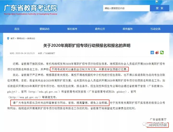 而关于“不用考试就可以拿到全日制专业文凭”的说法,4月23日,广东省教育考试院也发出了广东省教育厅的正式声明。