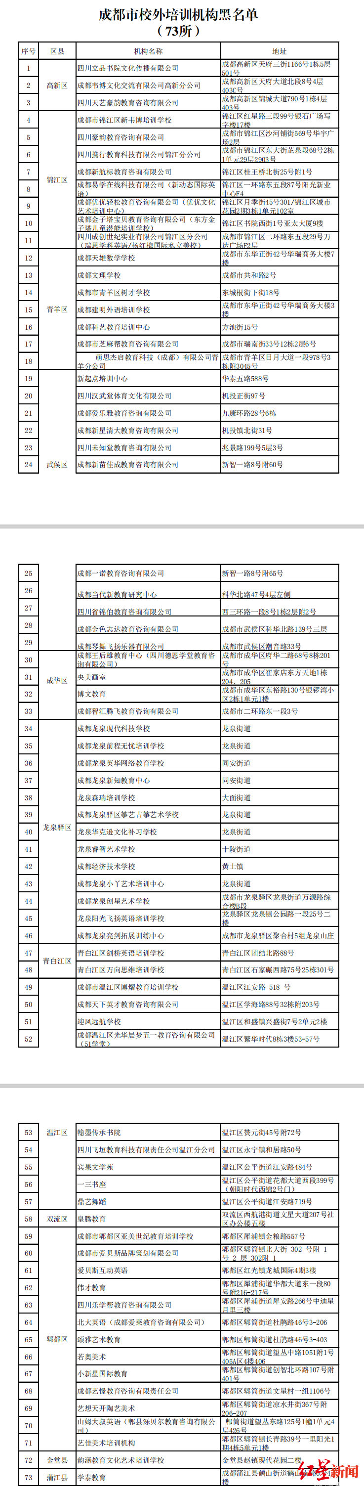 记者梳理发现,在成都市范围内,这批黑名单上榜机构排名最多的区为龙泉驿区和郫都区,分别各有13家黑榜机构。