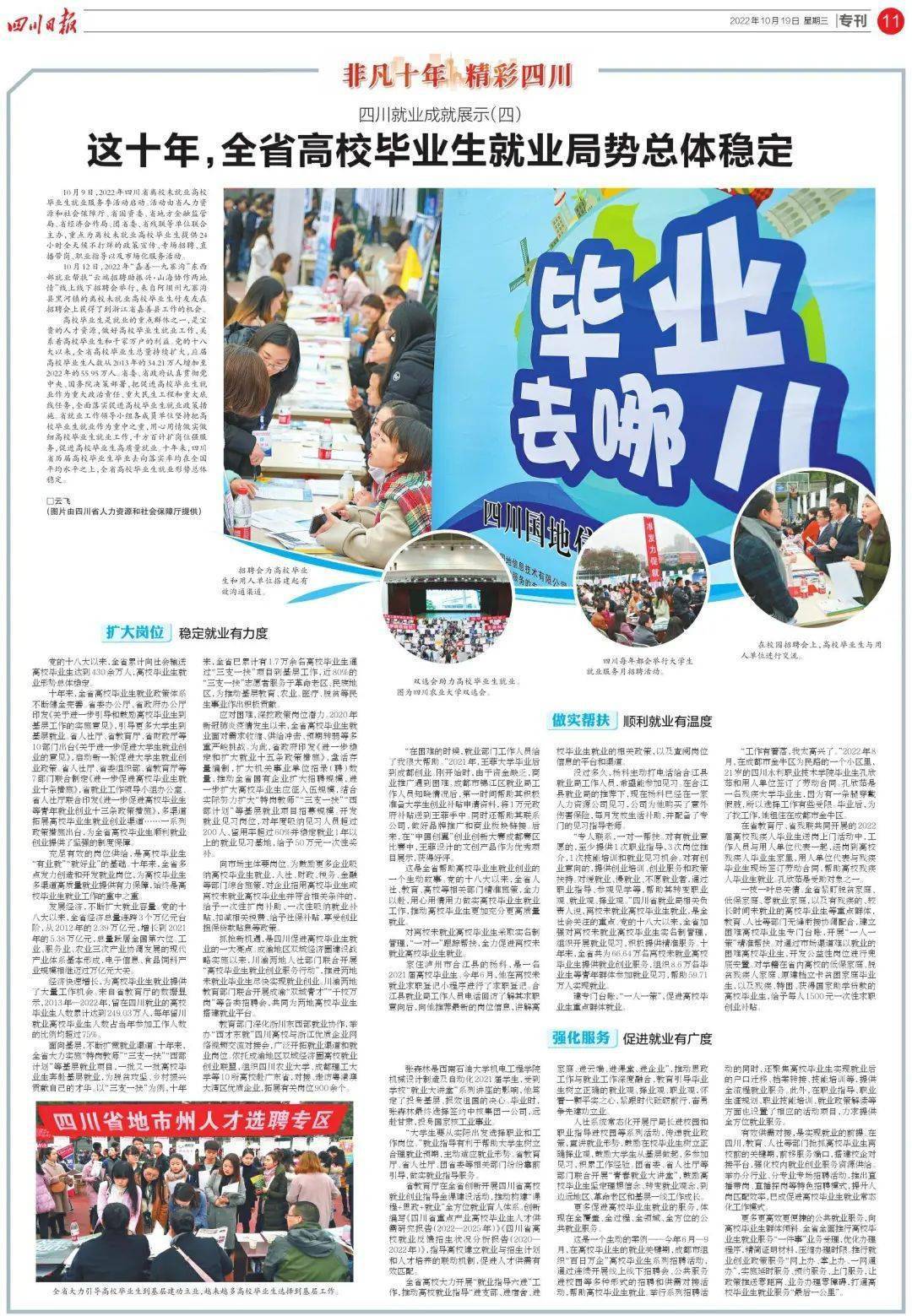 近日,《四川日报》专刊版“非凡十年 精彩四川”刊发文章《四川就业成就展示(四):这十年,全省高校毕业生就业局势总体稳定》,报道我省就业成果。该文指出,党的十八大以来,全省高校毕业生总量持续扩大,应届高校毕业生人数从2013年的34.21万人增加至2022年的55.95万人。十年来,四川省历届高校毕业生毕业去向落实率均在全国平均水平之上,全省高校毕业生就业形势总体稳定。