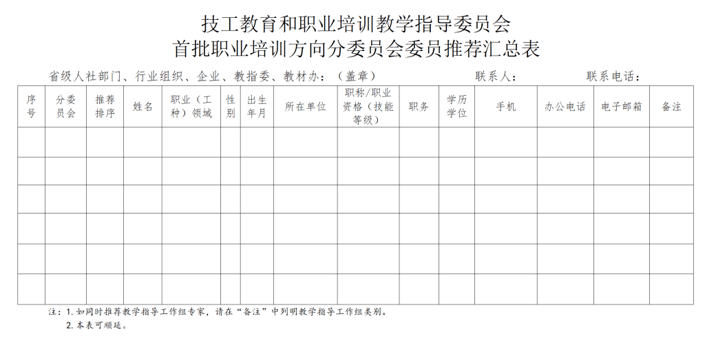 1.各省级人力资源社会保障部门负责推荐本区域内有关院校、职业培训机构、教研机构、企业的专家。每个省份可推荐10名专家,其中每个分委员会不超过2名专家。