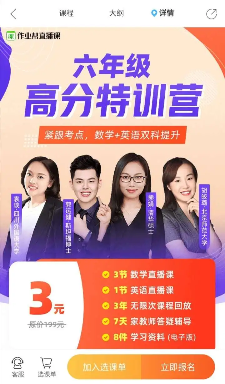 作业帮则在其APP中推出了3元2科的优惠活动,以小学六年级为例,3元的课程套餐包含了3节数学直播课与1节英语直播课,以及7天的教师答疑辅导和8件价值399元的电子版学习资料。
