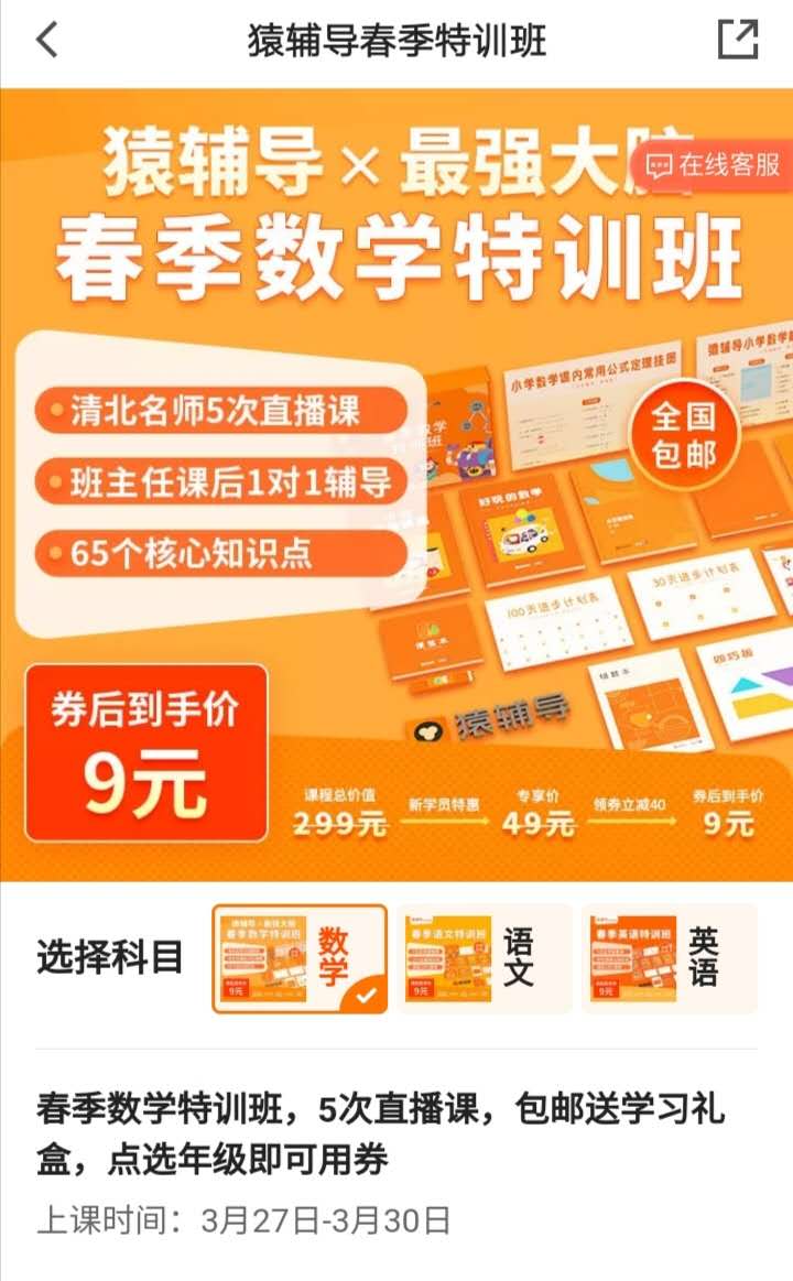猿辅导则推出了9元春季特训班。以数学学科为例,课程总价值为299元,新学员特惠价为49元,同时使用40元的优惠券,便可以9元的价格获得5节直播课,同时免费送全套学习礼盒,包含讲义习题集、文具等。
