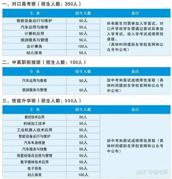2、中考成绩需达到学校的提档分数线: 对口高考班:语、数、外总分达到三科总分的60%及以上。三年中职班:中考成绩达到全科总分50%。录取方式