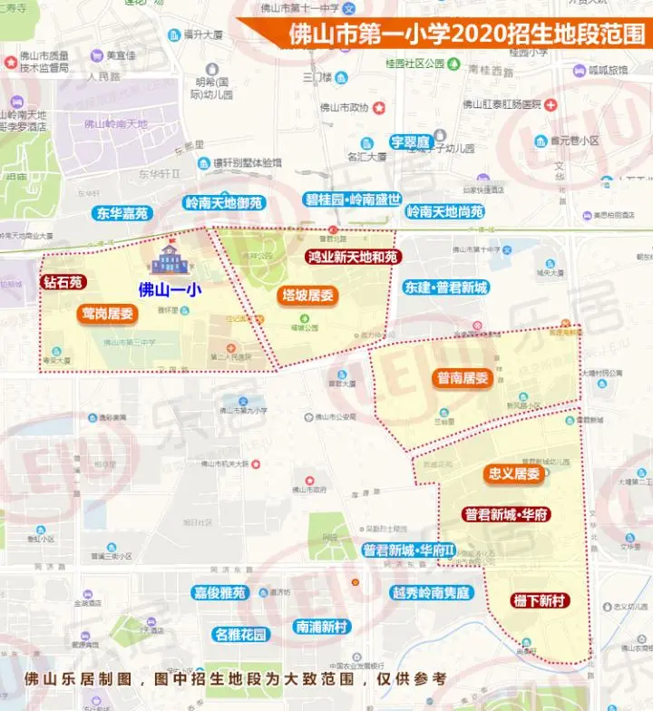 2020年佛山一小招生地段为:莺岗居委、塔坡居委、普南居委、忠义居委。