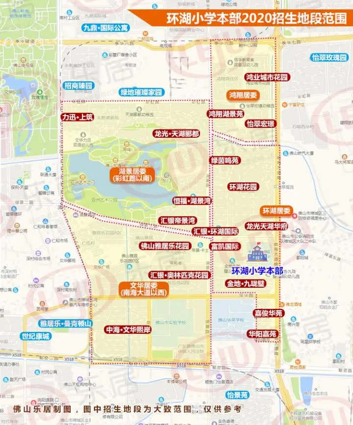 2020年环湖小学本部招生地段为:鸿翔居委、湖景居委(彩虹路以南)、文华居委(南海大道以西)、环湖居委。