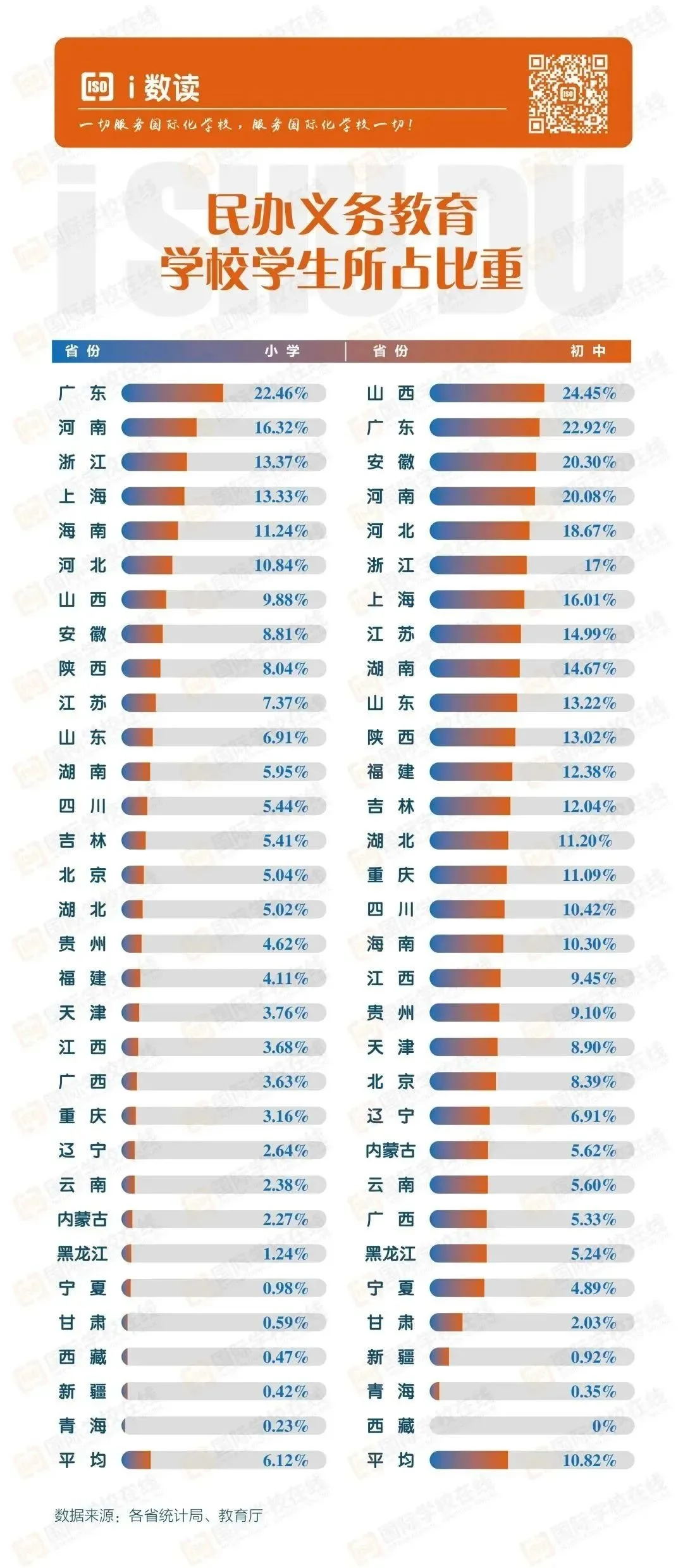 广东省小学和初中阶段民校生占比都超过了22%,是当之无愧全国义务教育阶段民校生占比最多的省份。