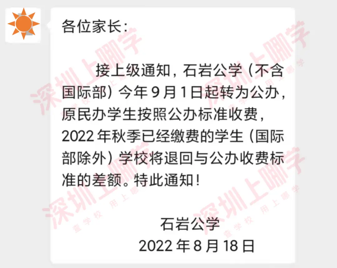 8月18日,深圳市国有民办学校之一的石岩公学给家长发了群消息,声明自今年9月1日起,学校(不含国际部)将转为公办学校,2022年秋季已经缴费的学生(国际部除外)将退回差额。此前被猜测许久的石岩公学转公一事,终于尘埃落定。
