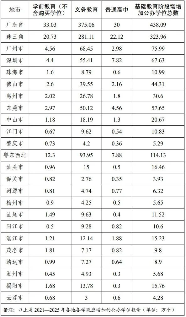 2021年9月,广东省人民政府印发的《广东省推动基地教育高质量发展行动方案》(下简称《方案》),各市都有被分配到需增加公办学位总数。