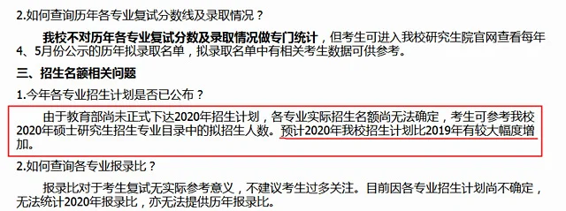 广西大学:由于教育部尚未正式下达2020年招生计划,各专业实际招生名额尚无法确定,考生可参考我校2020年硕士研究生招生专业目录中的拟招生人数。预计2020年我校招生计划比2019年有较大幅度增加。