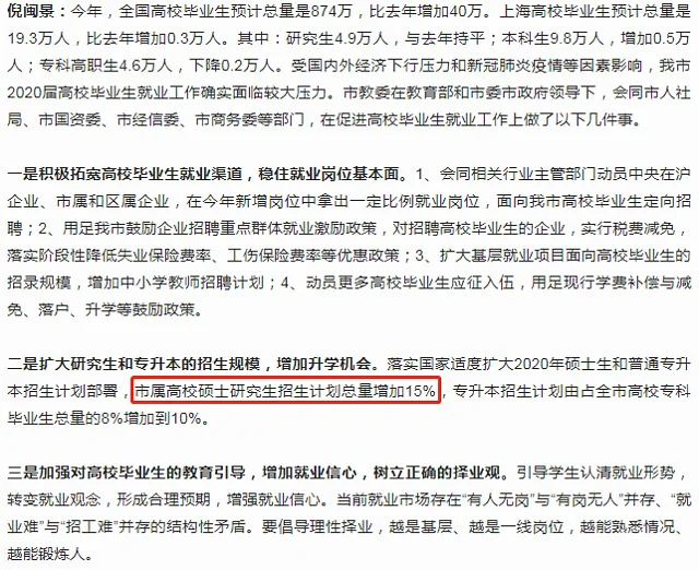 上海市疾控中心举行的第41场新闻发布会上,上海市教委副主任倪闽景表示,将落实国家适度扩大2020年硕士生和普通专升本招生计划部署,市属高校硕士研究生招生计划总量增加15%,专升本招生计划由占全市高校专科毕业生总量的8%增加到10%,为有志于升学深造的毕业生提供更多的机会。