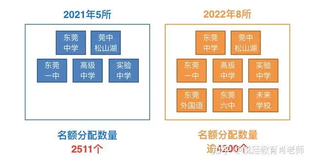 2021年参与名额分配的学校有东莞中学、东莞中学松山湖学校、东莞市第一中学、东莞实验中学、东莞高级中学,名额分配数量2511个;今年东莞外国语学校、东莞市第六高级中学、东莞松山湖未来学校3所学校新增参与分配,名额数量逾4200个。