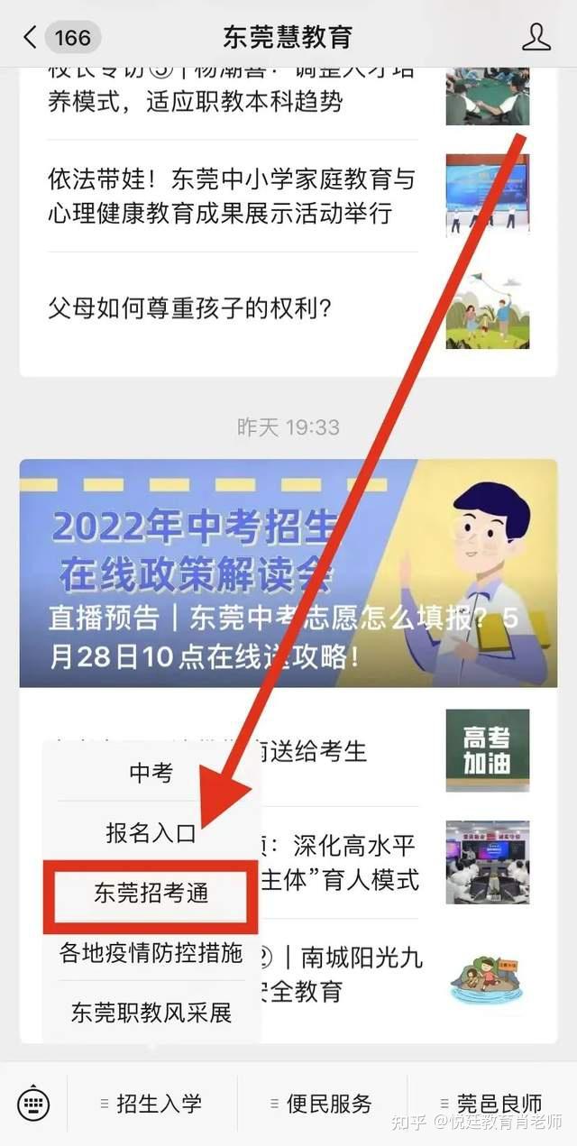家长可关注“东莞慧教育”或“东莞市教育局”微信公众号,点击页面下方“东莞招考通”,随时随地、全面及时了解和掌握招生政策和招生资讯。