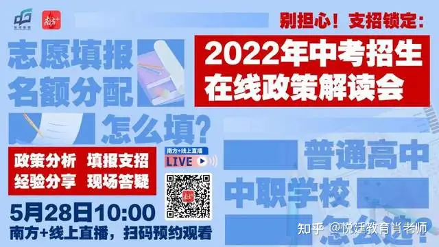 根据今年招生录取工作安排,中考志愿填报时间为6月2日-7日,5月28日10:00,东莞市教育局联合南方+推出了2022年中考招生在线政策解读会,详解今年中考政策变化、志愿填报平台操作、中职招生政策等关键问题,并邀请往届生家长参与经验分享。