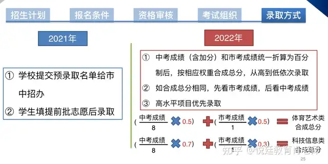 中考成绩(含加分)和市考成绩统一折算为百分制后,按相应权重合成总分,从高到低依次录取,如合成总分相同,先看市考成绩,后看中考成绩,高水平项目优先录取。