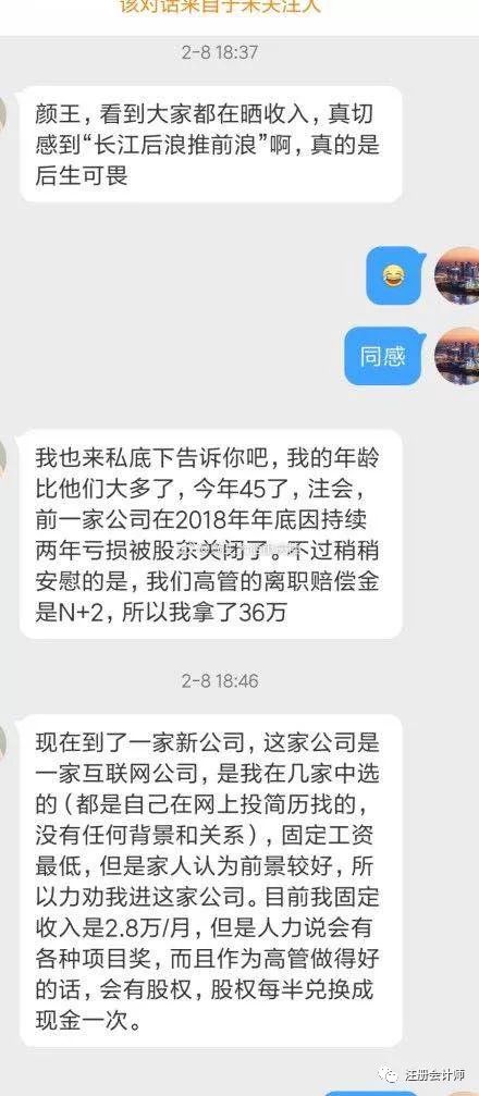 考出CPA后一直努力,现在45岁做到了公司的高管,年薪在50万以上,净资产已经达到了衣食无忧的水平。因为公司亏损关闭,拿到了36万的赔偿金,跳槽到现在的互联网公司,月薪2.8万,也就是说固定年薪至少在35万以上。除此之外还有项目奖及股权。