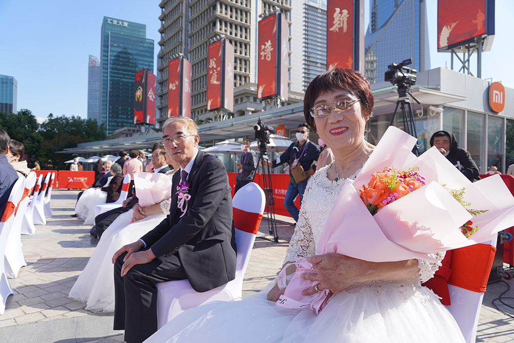 金婚伉俪手捧小朋友送上的鲜花。本文图片均为 澎湃新闻记者 邹佳雯 图六对沪上的金婚伉俪身着婚纱礼服,携手登上东方明珠,为活动“登高”送祝福。现场的文艺演出精彩纷呈:上海老年大学管乐团吹响“走向复兴”的号角;青年党员与老年学员齐将“颂歌献给党的二十大”;上海评弹团团长高博文带领老年学员共演“江南好风光”;可爱的“小荧星”们奉上民族舞蹈。来自上海老年大学联盟分校的表演队也奉上了朗诵、舞蹈、乐器合奏等节目。此外,今年首次有外省市老年大学通过视频共同参会。