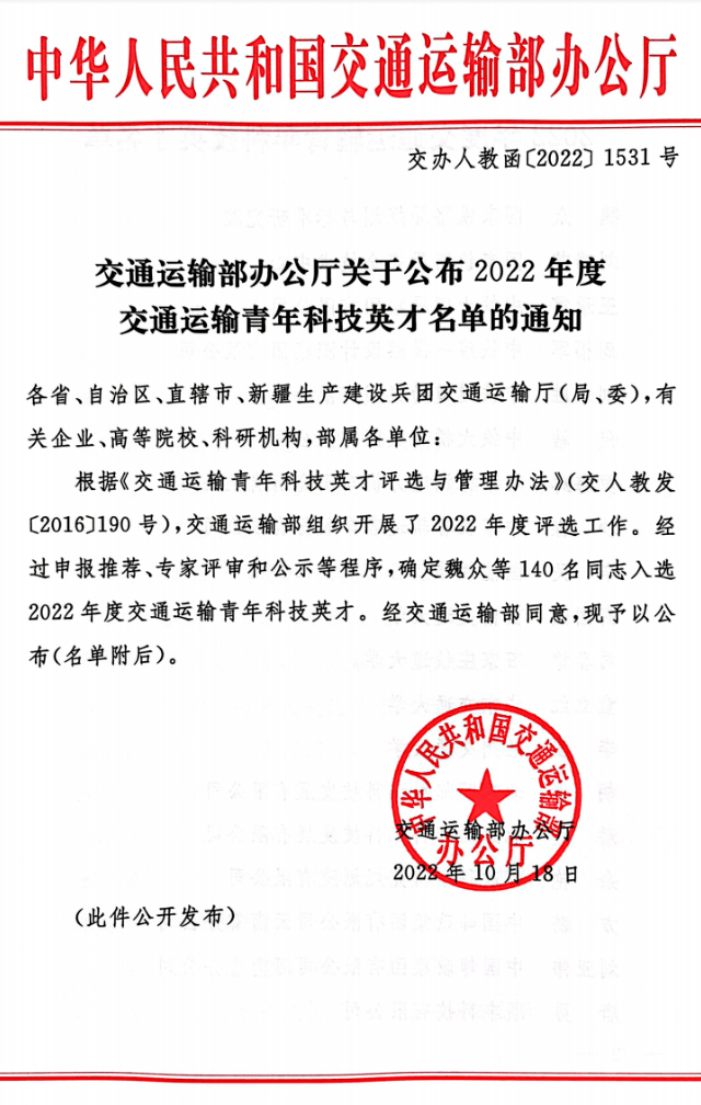根据《交通运输青年科技英才评选与管理办法》(交人教发[2016]190号),交通运输部组织开展了2022年度评选工作。