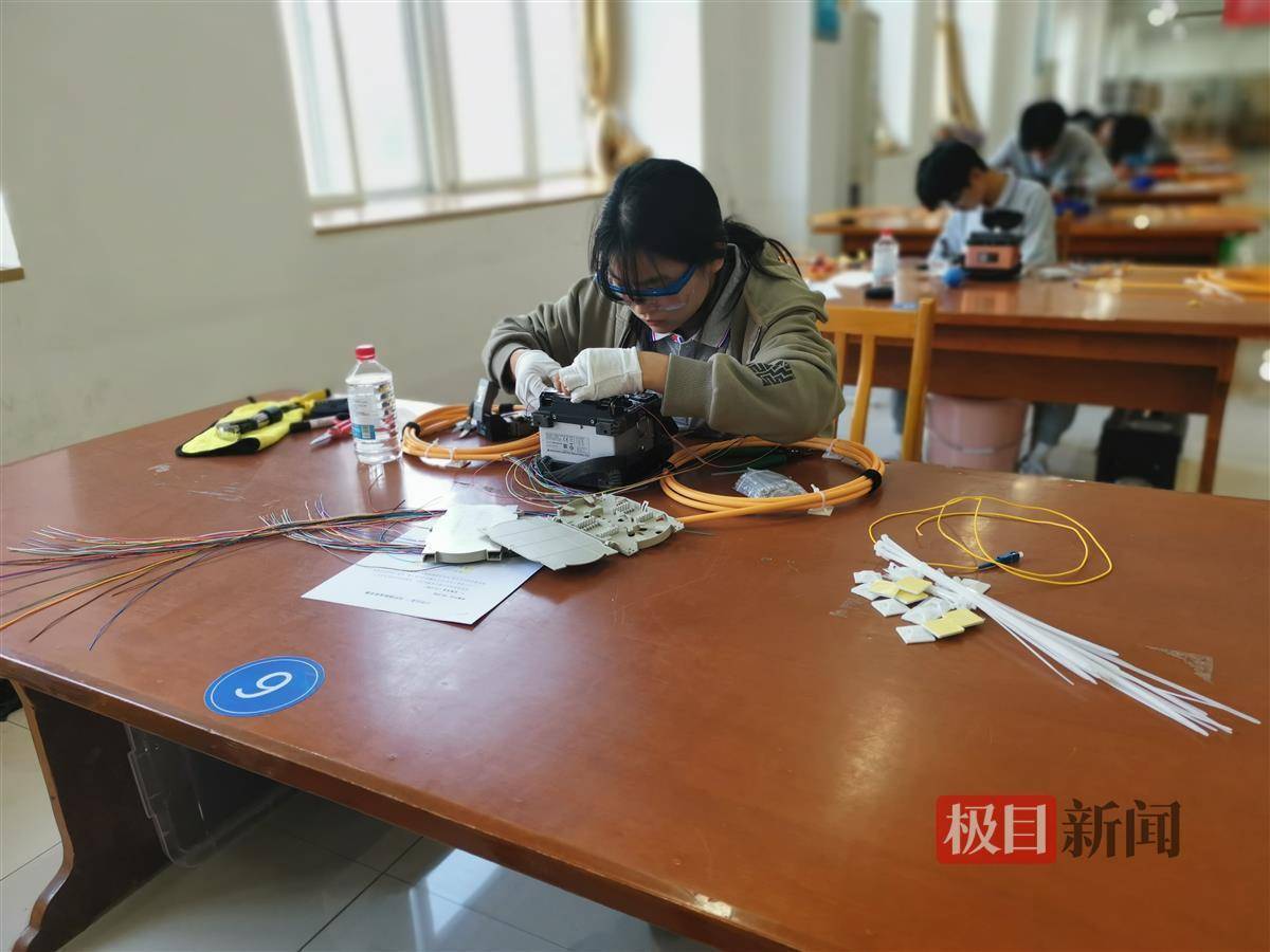在图书馆3楼,信息网络布线赛项的现场,选手们比的则是“手速”,他们的动作也像是按下了“快放键”。选手们先后进行了铜缆端接速度竞赛、光纤熔接速度竞赛,通俗地说就是传统网线装水晶头和两段光纤的连接。