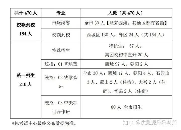 市统筹(一):30人校额到校招生:本区131人,外区26人,总计157人2、统招:国际部:招收60人科技综合素质实验班:专业代码02 30人普通班:专业代码01 223人 其中:艺术、体育和科技三类特长生63人2020年,中招录取分数线为普通班562分,一般西城区前1200名的学生都有机会被八中录取。八中每年在各区招收的学生都在本区排名前100。