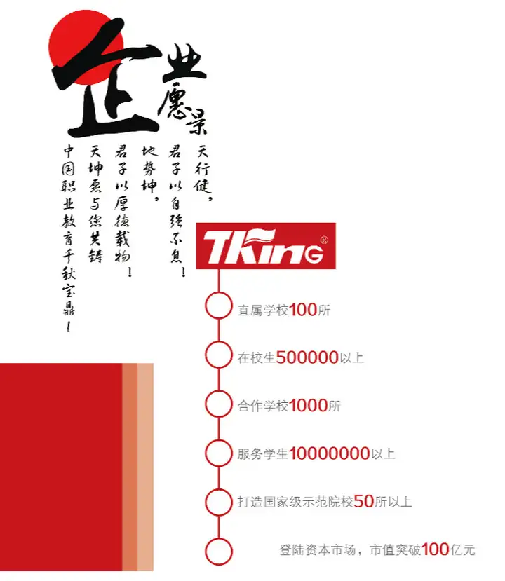 天坤教育成立于2009年,是中国的职业教育全产业链服务集团,涵盖学历职业教育投资、非学历职业技能培训和实习就业服务三大领域,目前已直属中等职业教育学校31所,高等职业教育二级学校50余所,共建职业合作院校100余所,全日制在校生达10余人,教职工近5000人,职业培训基地近50个,每年为20余万职教学生提供实习就业服务,是布局职业教育全产业链的大型职教集团。天坤教育“职前教育+实习就业+职后发展”人才终身服务模式,为16-80岁的技能型人才提供职业教育和职业服务;天坤教育“定制化培养+结构化供应”产教融合人才供给模式,为10000家名企提供高技能人才解决方案;天坤教育还在积打造职业教育产教融合路由器(职业教育+互联网),利用大数据+人工赋能职业教育行业。