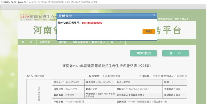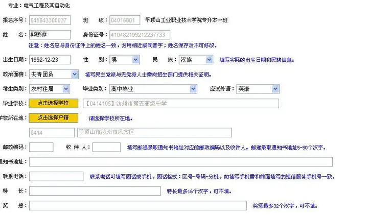 个人信息:凡是参加过河南省高考的同学,信息会有,没有的自行填写