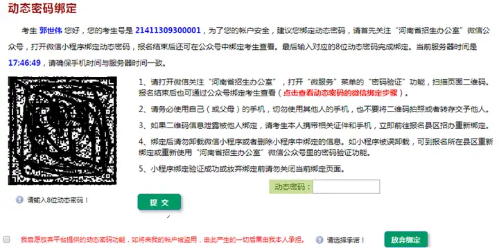十、动态密码绑定(也可以不绑定),考生号已生成,手机拍照保存。可点击绿色放弃绑定按钮,如选择绑定,不可以更换手机、手机号,直至专升本录取结束。