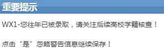 NO3考生选择了高职或以上学历,但年龄小于20岁。(直接忽视保存,返校现场信息采集时统一处理)WH4填写了河南省户籍,存在查疑。(直接忽视保存,并向辅导员老师登记户籍信息)N19考生没有在河南省参加普通高招并被录取的记录。(直接忽视保存,并向辅导员老师做好登记即可)W15考生父母信息不全。(父母离异/已故/单亲等,查看户口本或询问家人父母身份证信息,填写完整)W26考生与其父母姓氏均不相同。(此警告信息大多存在与单亲/离异/父母再婚等,请考生尽量完整填写姓氏相同父母信息)W16考生与父母民族信息不一致,先保存后提供材料。(需要市级民族主管部门和公安部门相关证明)WCO/WDO考生父母户籍信息或职业信息与另一考生不相同。(这种情况为考生本人有兄弟姐妹也在参加高考/对口/专升本考试,两人父母工作单位,户籍信息必须完全填写一致)WH1考生姓名与身份证信息姓名不一样。(此警告信息一般存在有曾用名考生,能修改就修改下,不能修改先忽视保存)祝同学们网上报名顺利!