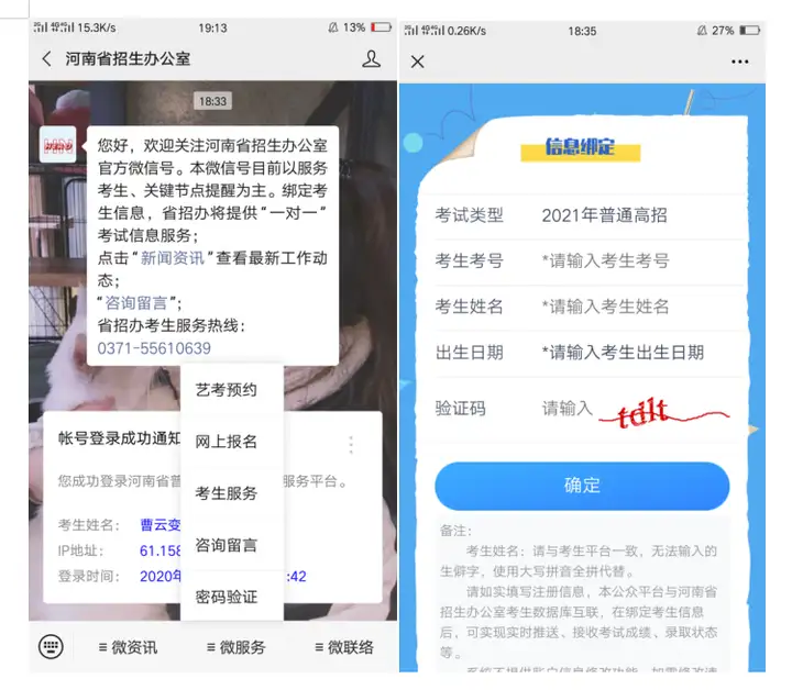 十二、关注并绑定河南省招生办公室微信公众号,“微服务”--“考生服务”--“信息绑定”。