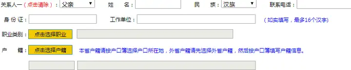 9、监护人信息:要求必须先填写关系人一父亲、关系人二母亲。双方必须填写完整,不能只填一个,关系人三处“点击清除”。(如有离异、单亲、已故也要填写完整,备注选已故。填写不完整将出现警告信息,影响网上报名)。