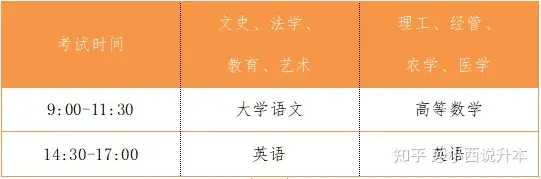 文史、法学、教育、艺术四类的考试科目为大学语文和英语;理工、经管、农学、医学四类的考试科目为高等数学和英语。各科目满分均为150分。具体考试时间如下: