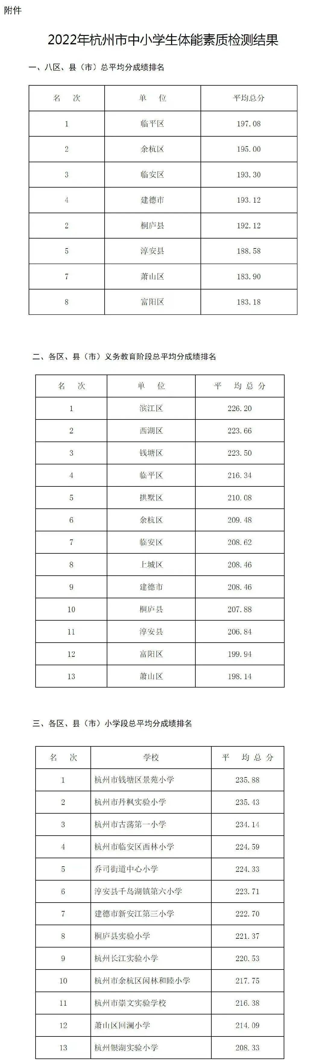 杭州市教育局办公室关于公布2022年杭州市中小学生体能素质检测结果的通知杭教办德体卫艺〔2022〕152号